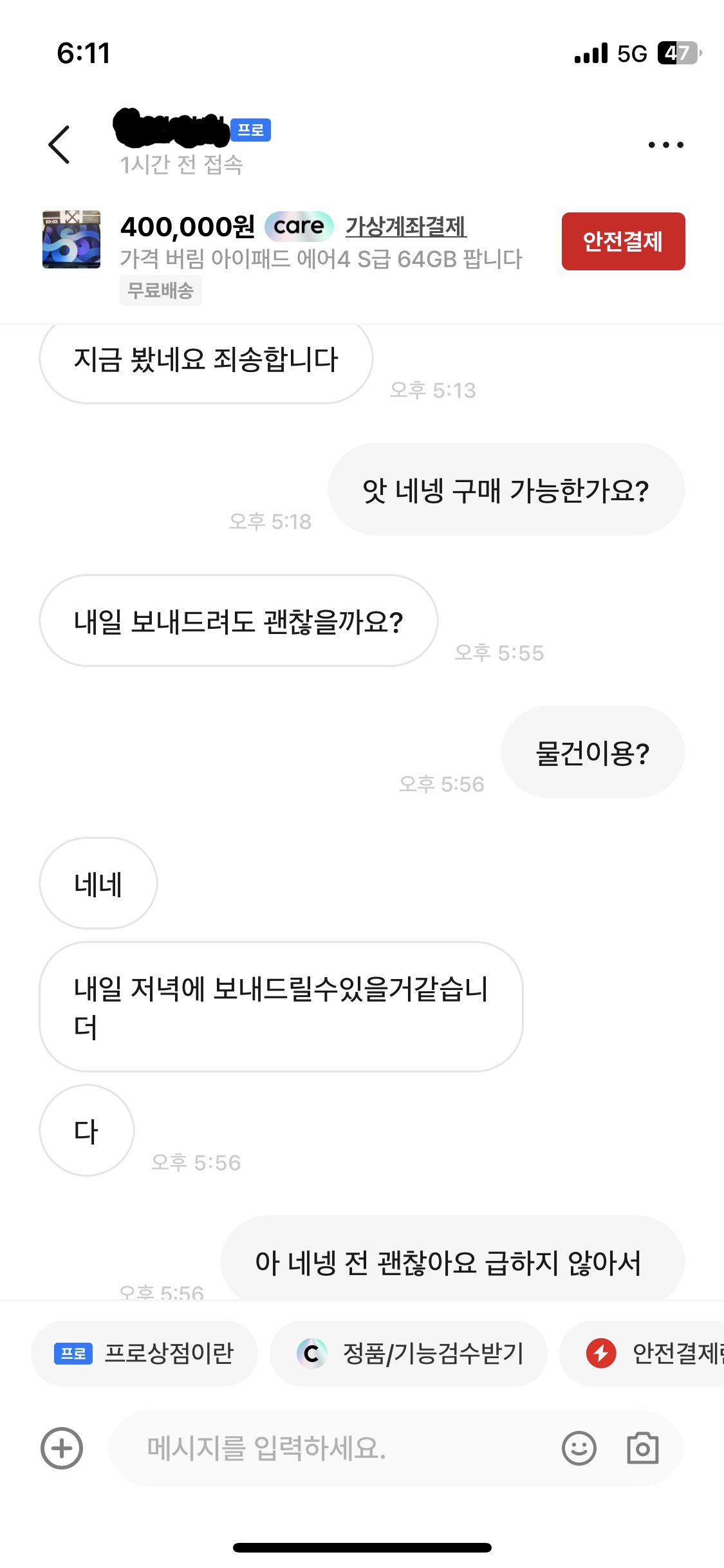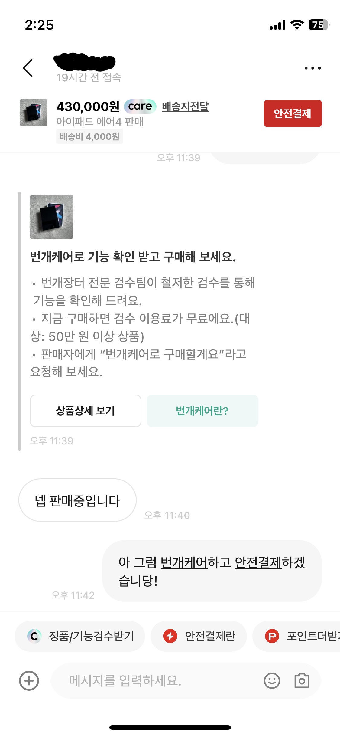 판매하는지 묻고 번개케어&번개 페이하겠다고 하니